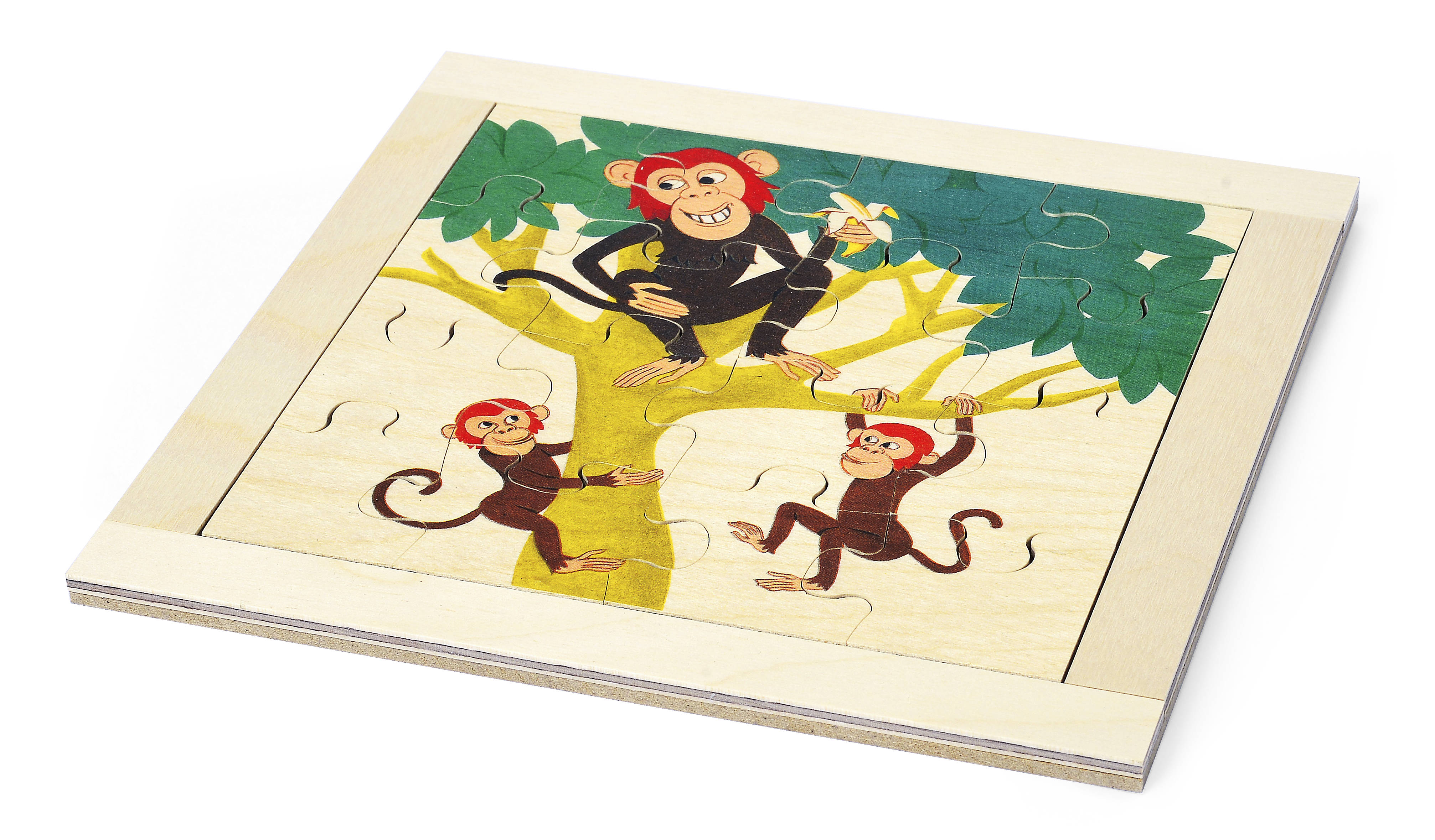 Das 16-teilige Puzzle zeigt eine fröhliche Affenfamilie beim Spielen und ist ideal für Kinder ab 3 Jahren.