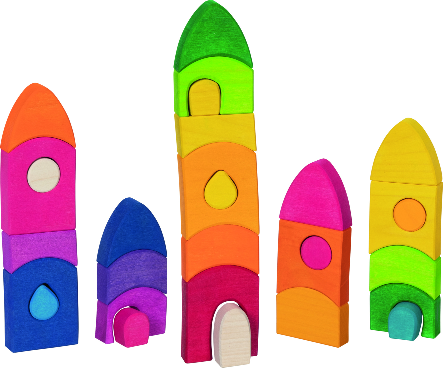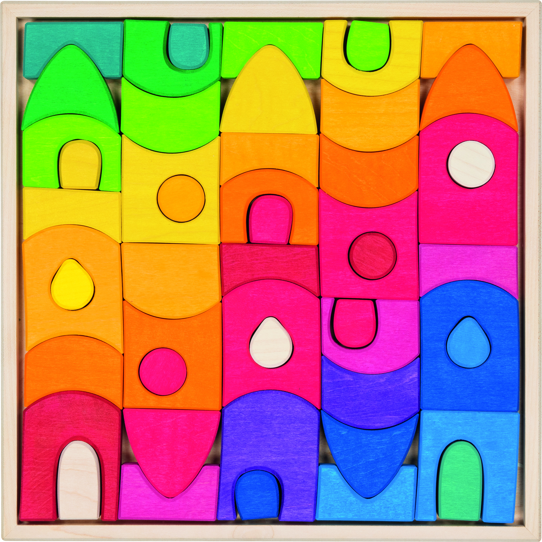 Mit goki evolution haben die Kinder die Möglichkeit kreative Welten zu erschaffen, so vielfältig wie sie selber sind. Und so wollen wir auch gar nicht sagen, was das hier ist. Vielleicht bilden die Holzpuzzleteile irgendwann ein Dorf oder sie werden zum bunten Zauberwald. Auf jeden Fall bestehen sie aus hochwertigem Ahornholz und die leuchtende Lasierung lässt ihre Holzstruktur noch erkennen. Ein echtes Holzspielzeug gefertigt in Europa.
