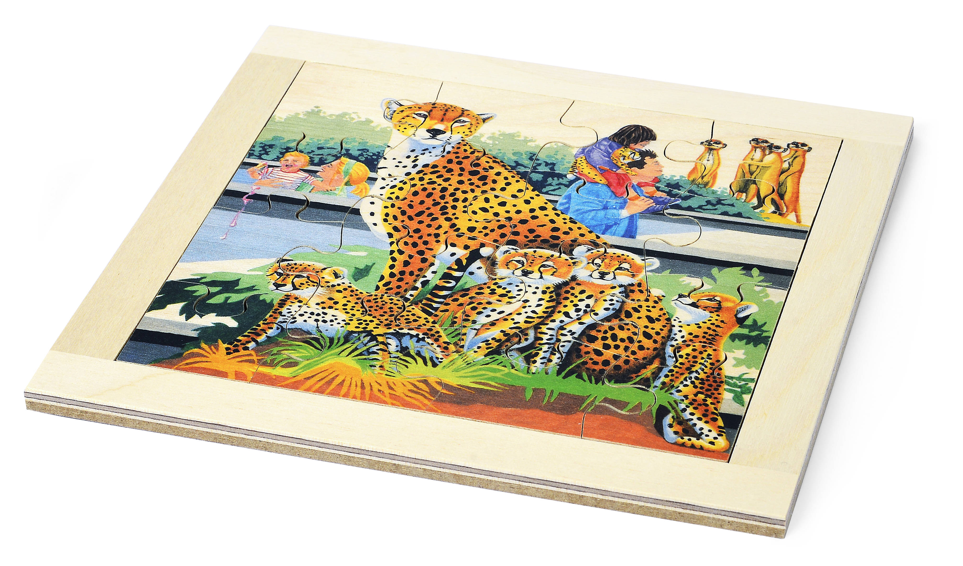 Dieses handliche Puzzle mit 16 Teilen zeigt eine Gepardenfamilie in kindgerechtem Design. Ideal für Kinder ab 3 Jahren, um spielerisch Feinmotorik, Konzentration und das Erkennen von Formen zu fördern.