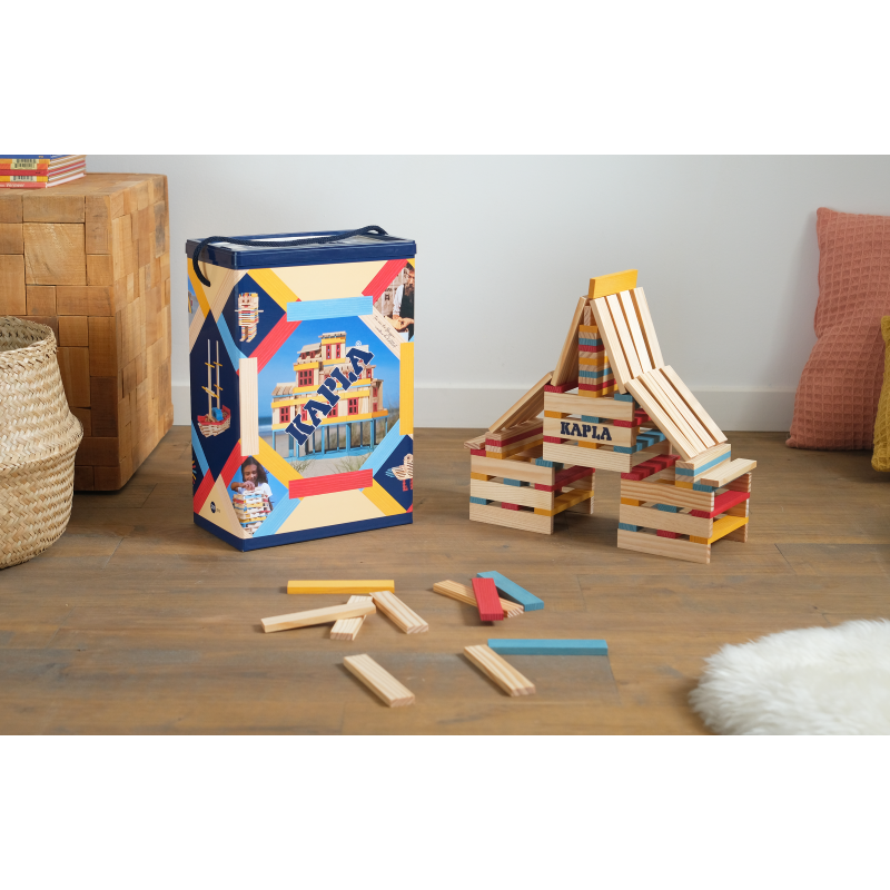 Die KAPLA-Plättchen sind aus naturbelassenem, nachhaltigem Pinienholz (Seekiefer) gefertigt, das aus französischen, zu 100% nachhaltig bewirtschafteten Wäldern stammt. Die farbigen Holzplättchen sind mit lebensmittelechter Farbe gefärbt.