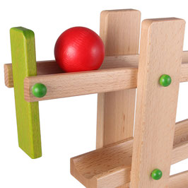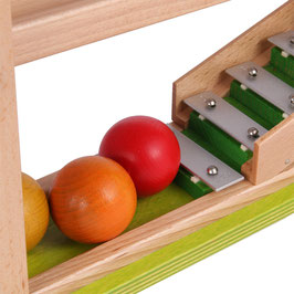 Die faszinierende Konstruktion ermöglicht es, dass die Kugeln auf den drei hölzernen Schienen hinabrollen und schließlich ein harmonisches Glockenspiel erklingen lassen. Diese Kugelbahn fördert die Neugierde, die Feinmotorik und das Verständnis für Ursache-Wirkungs-Beziehungen.