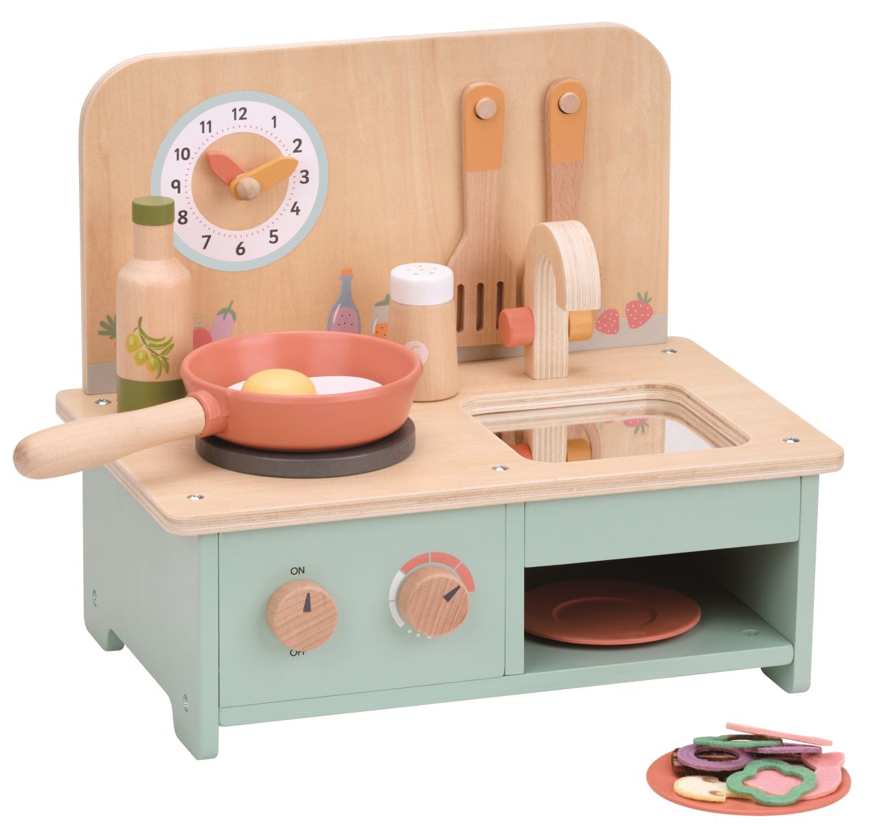 Schöne kleine Spielküche aus hochwertigem Holz von Spielba. Das 18-teilige Set beinhaltet neben der Küche 1 Bratpfanne, 1 Salzstreuer, 1 Olivenölflasche, 2 Pfannenwender, 2 Teller, 1 Spiegelei und 9 Filzteile (Speck, Zwiebelnringe, Crevetten, etc.)