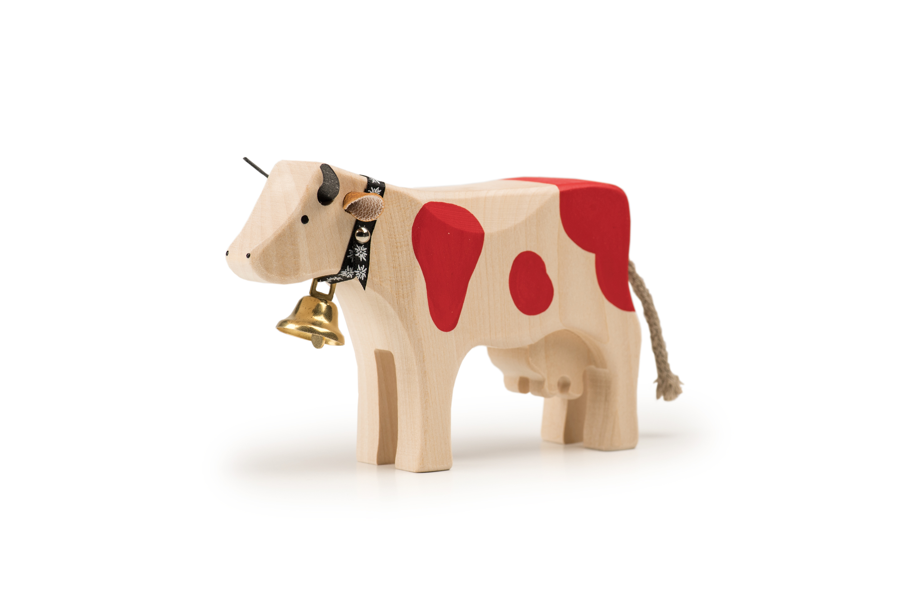 Die Kühe von Trauffer Holzspielwaren werden im Berner Oberland mit viel Liebe von Hand gefertigt. Dabei verwenden wir zertifiziertes FSC-Lindenholz aus nachhaltigen Schweizer Quellen und Farben, die für Kinder völlig unbedenklich sind. Die Schwänze der Kühe werden in der Seilerei Fehr im Thurgau hergestellt. Unsere Kühe sind besonders robust verarbeitet, sodass sie sich nicht nur als wunderschöne Souvenirs, sondern auch perfekt zum Spielen für Kinder eignen.