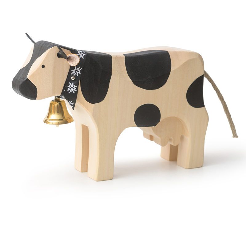 Jede Kuh wird im Berner Oberland von Hand gefertigt, aus FSC-zertifiziertem Lindenholz aus nachhaltiger Schweizer Forstwirtschaft – bemalt mit kindersicheren Farben. Die Schwänzli stammen übrigens aus der Seilerei Fehr im Thurgau.