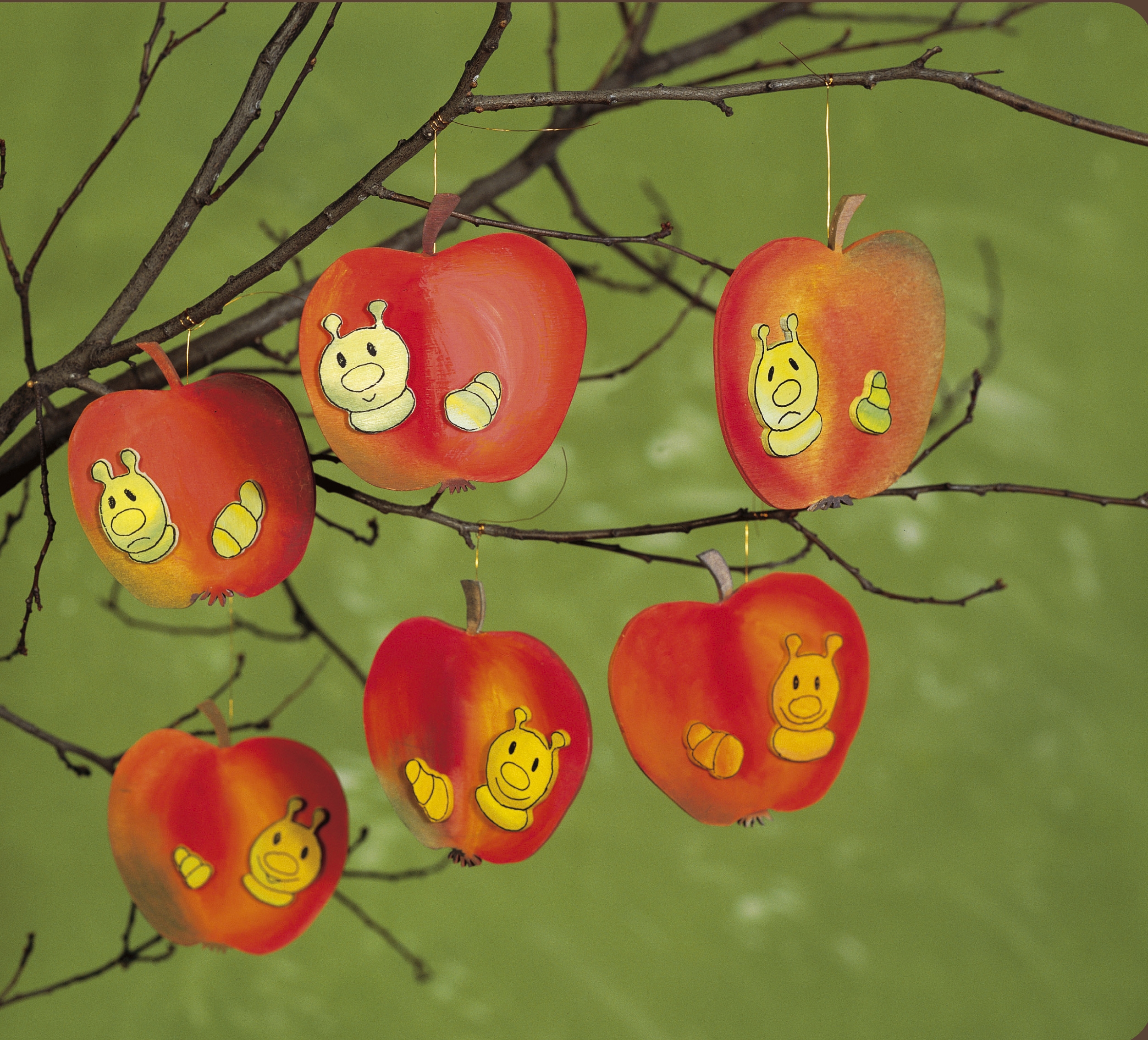 - Eine kreative Sperrholzvorlage, mit dem Motiv \"Äpfel mit Wurm\", bereit zum Aussägen mit einer Laubsäge.