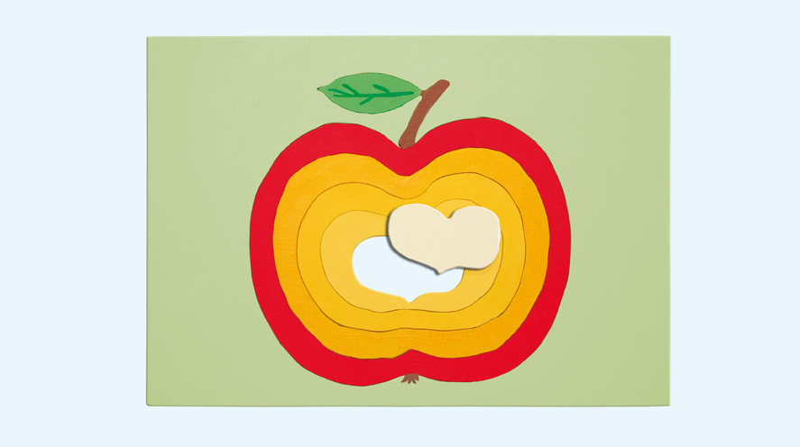 - Eine kreative Sperrholzvorlage, mit dem Motiv \"Apfel\", bereit zum Aussägen mit einer Laubsäge.