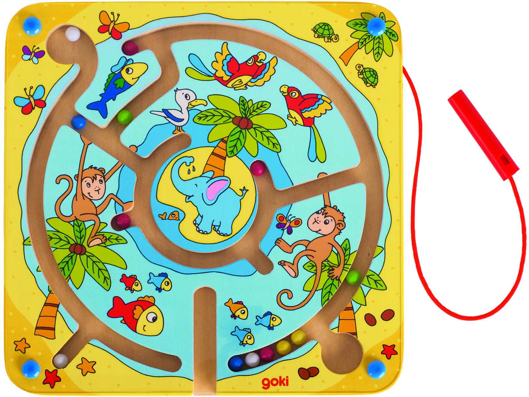 Die farbigen Kugeln müssen mit Hilfe des Magnetstabes durch das Labyrinth zu ihrem Ziel geführt werden. Die Kugeln können auch nach Farben sortiert zu unterschiedlichen Zielen gelenkt werden und das nicht nur von oben, sondern auch durch die Bodenplatte. Dies schult die Hand-Auge-Koordination und die Motorik. Das freche goki-Design erhöht den Spielanreiz.