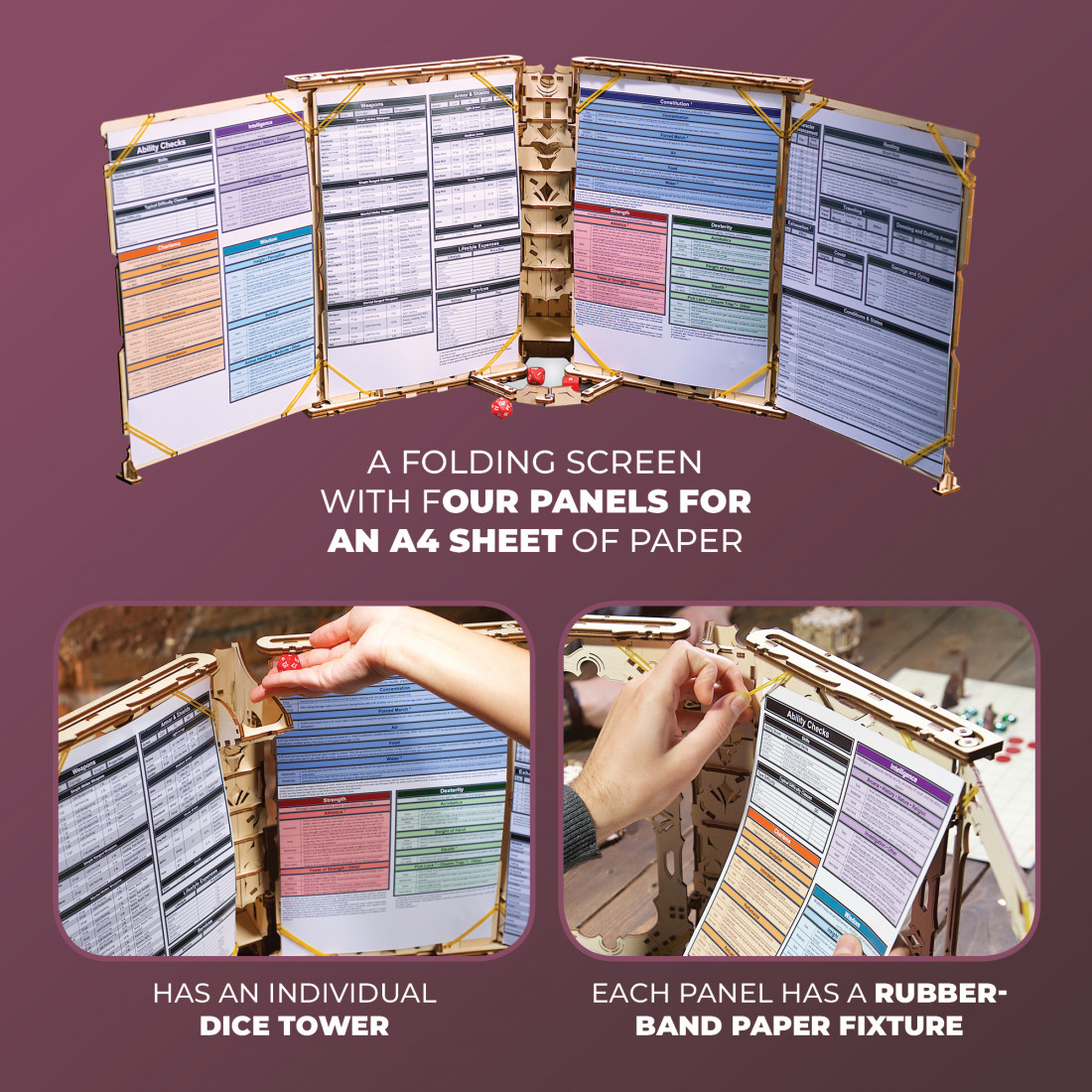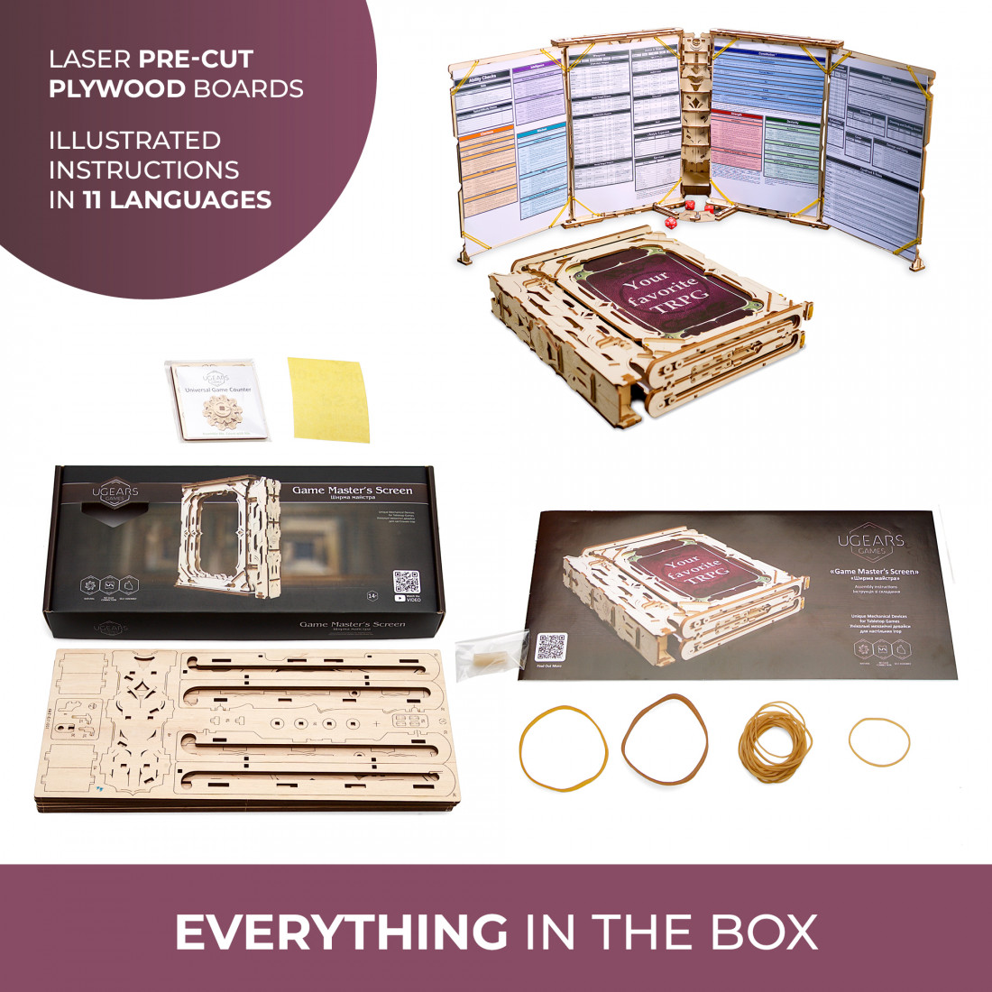 Die detailreichen Holzpaneele sind von Fantasy inspiriert und verleihen dem Spielleiter das Gefühl, ein uraltes Blatt über das grösste aller Abenteuer in der Hand zu halten. Dieses praktische und ästhetisch ansprechende Zubehör wird sicher zum Highlight jeder Spielrunde. Ugears hat damit erneut bewiesen, wie innovative Gestaltung und Funktionalität kombiniert werden können.