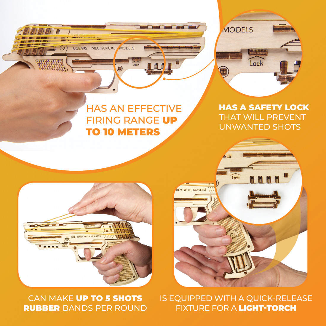 - 5-Schuss-Mechanik: Feuert fünf Gummibänder ohne Nachladen.