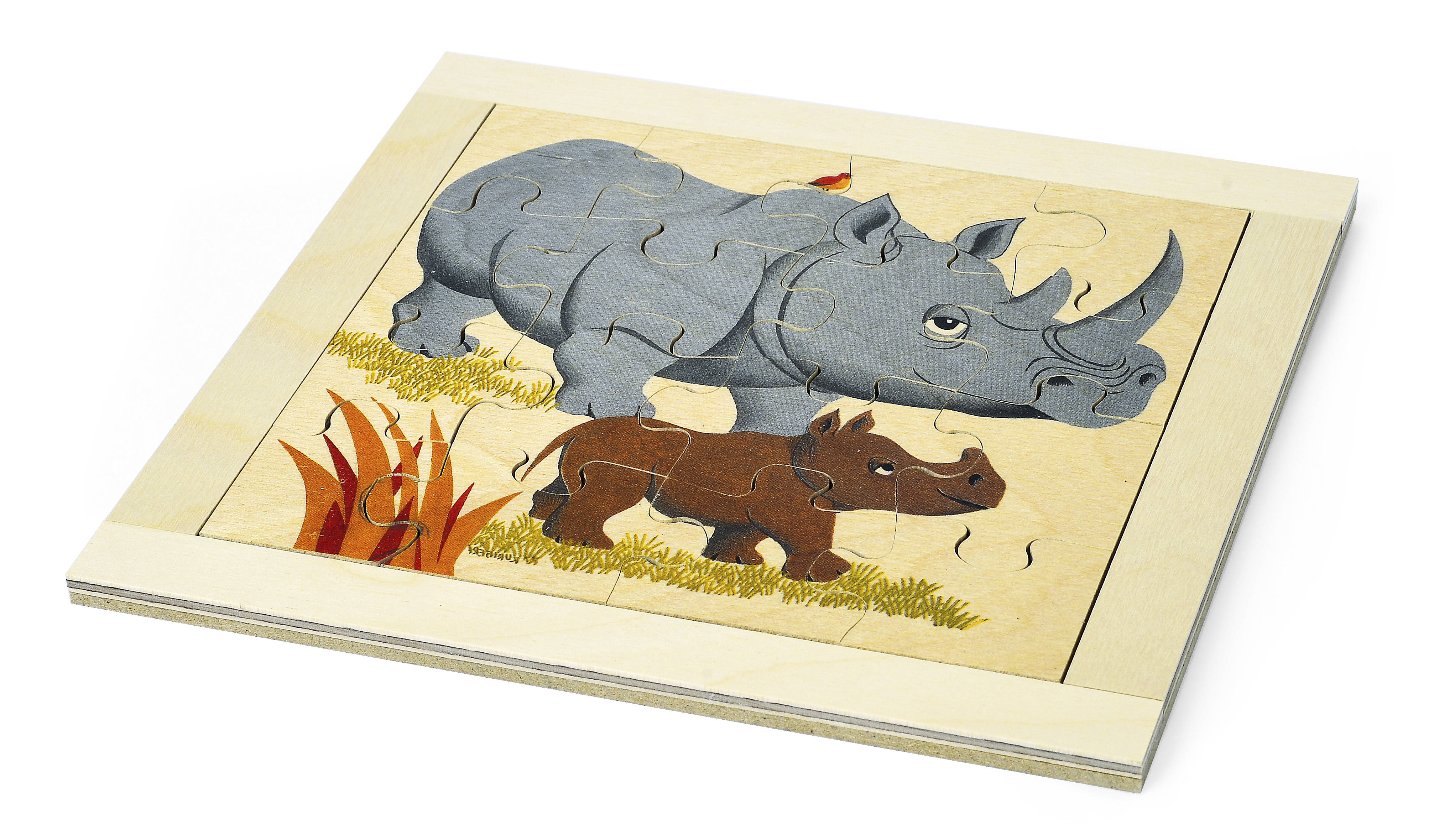 Dieses 16-teilige Sperrholzpuzzle zeigt eine friedliche Nashornfamilie in ihrer natürlichen Umgebung. Ideal für Kinder ab 3 Jahren, unterstützt es spielerisch die Entwicklung von Feinmotorik, Konzentration und das Interesse an Tieren der Wildnis.