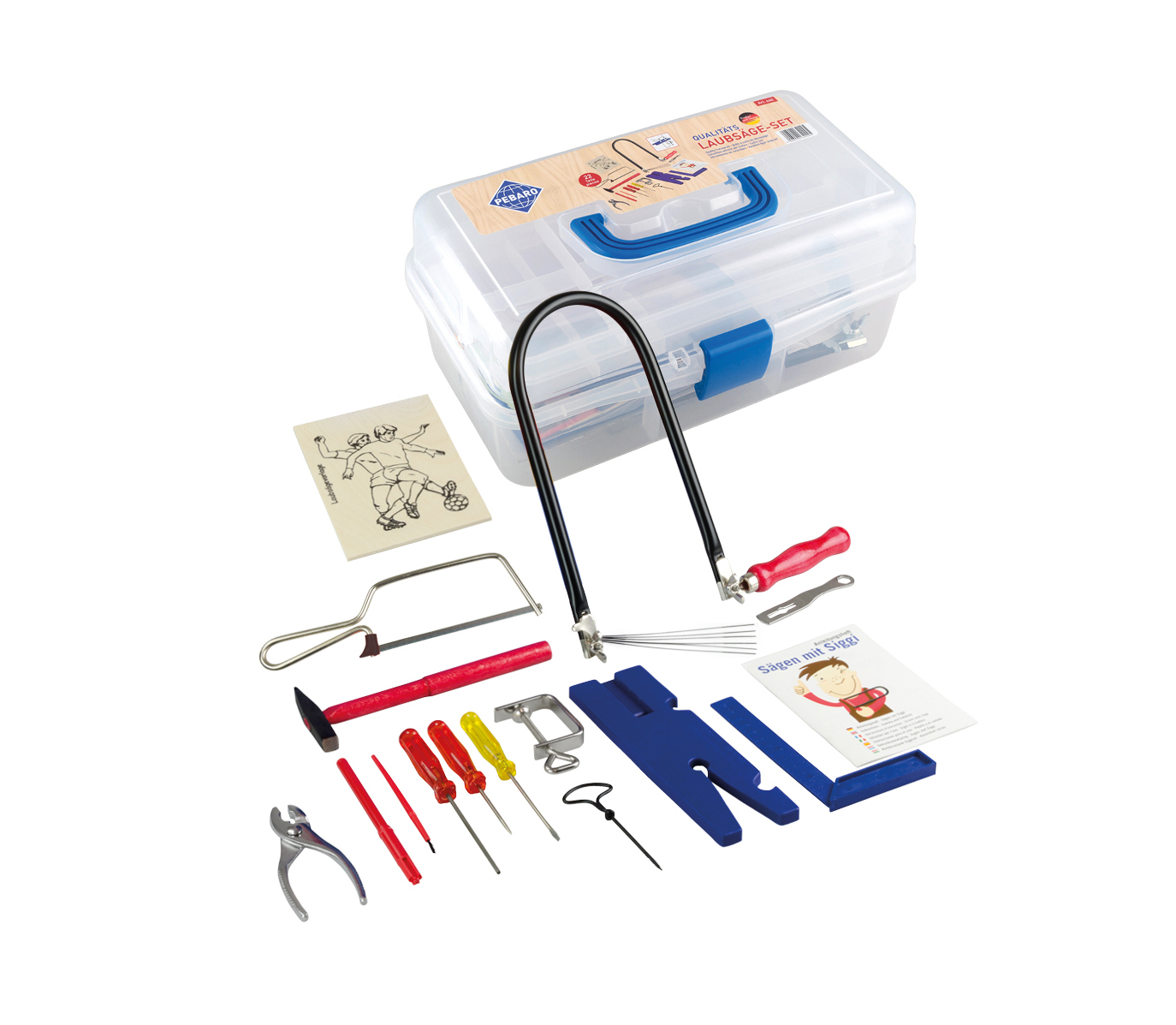 - Das Set enthält Laubsägewerkzeuge wie eine Laubsäge, ein Laubsägetischchen mit Einspannhalterung, eine Zwinge, Laubsägeblätter und einen Laubsägeschlüssel.