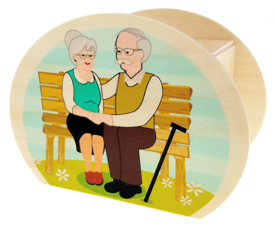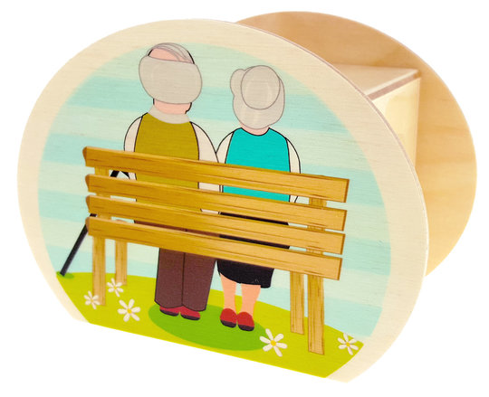 - Liebevolles Design: Oma-und-Opa Motiv auf Parkbank.