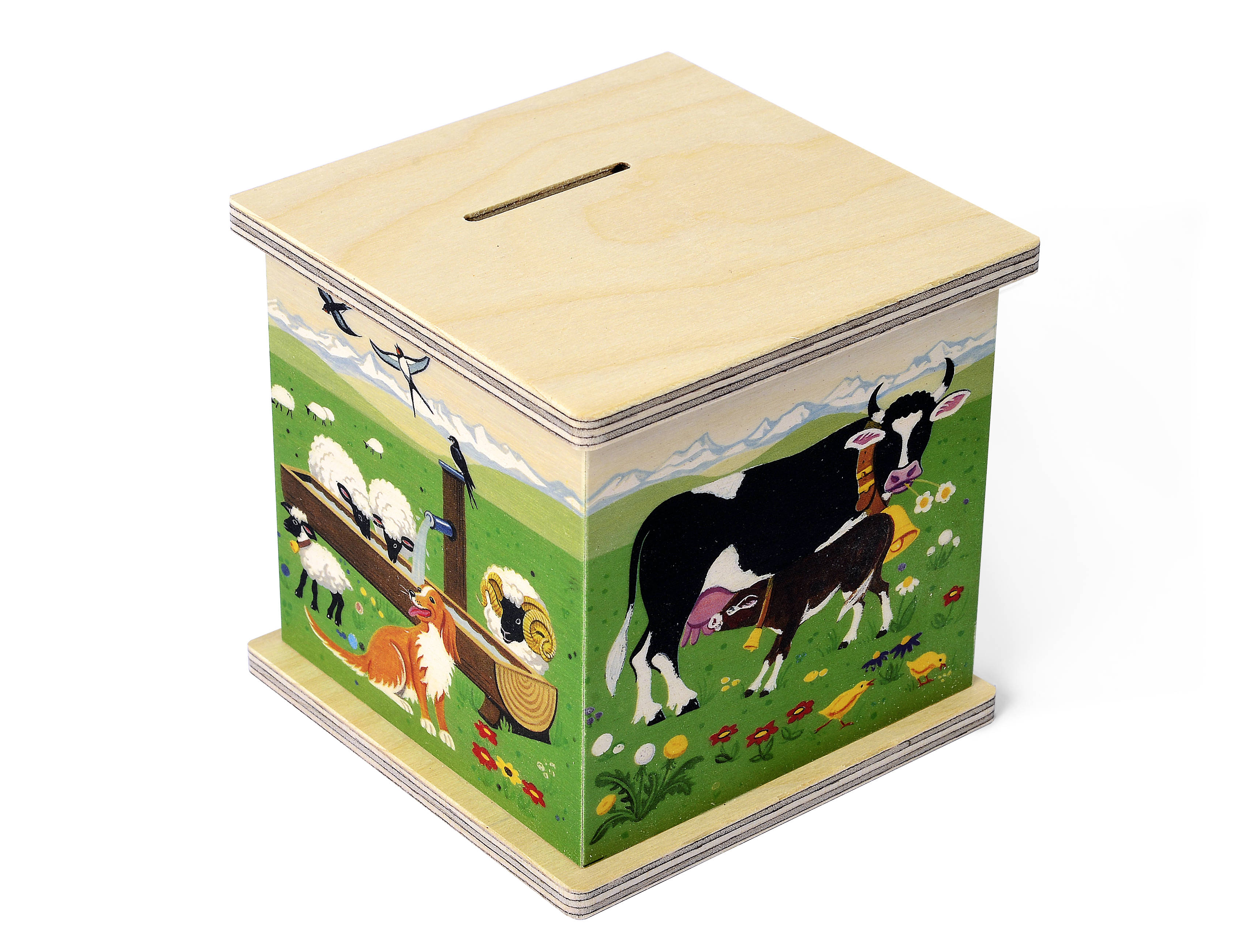 Diese dekorative Spardose zeigt verschiedene Bauernhoftiere als durchgehendes Panoramabild rund um das Gehäuse. Ein charmantes Detail fürs Kinderzimmer und ein ideales Geschenk zum Sparen mit tierischem Flair.