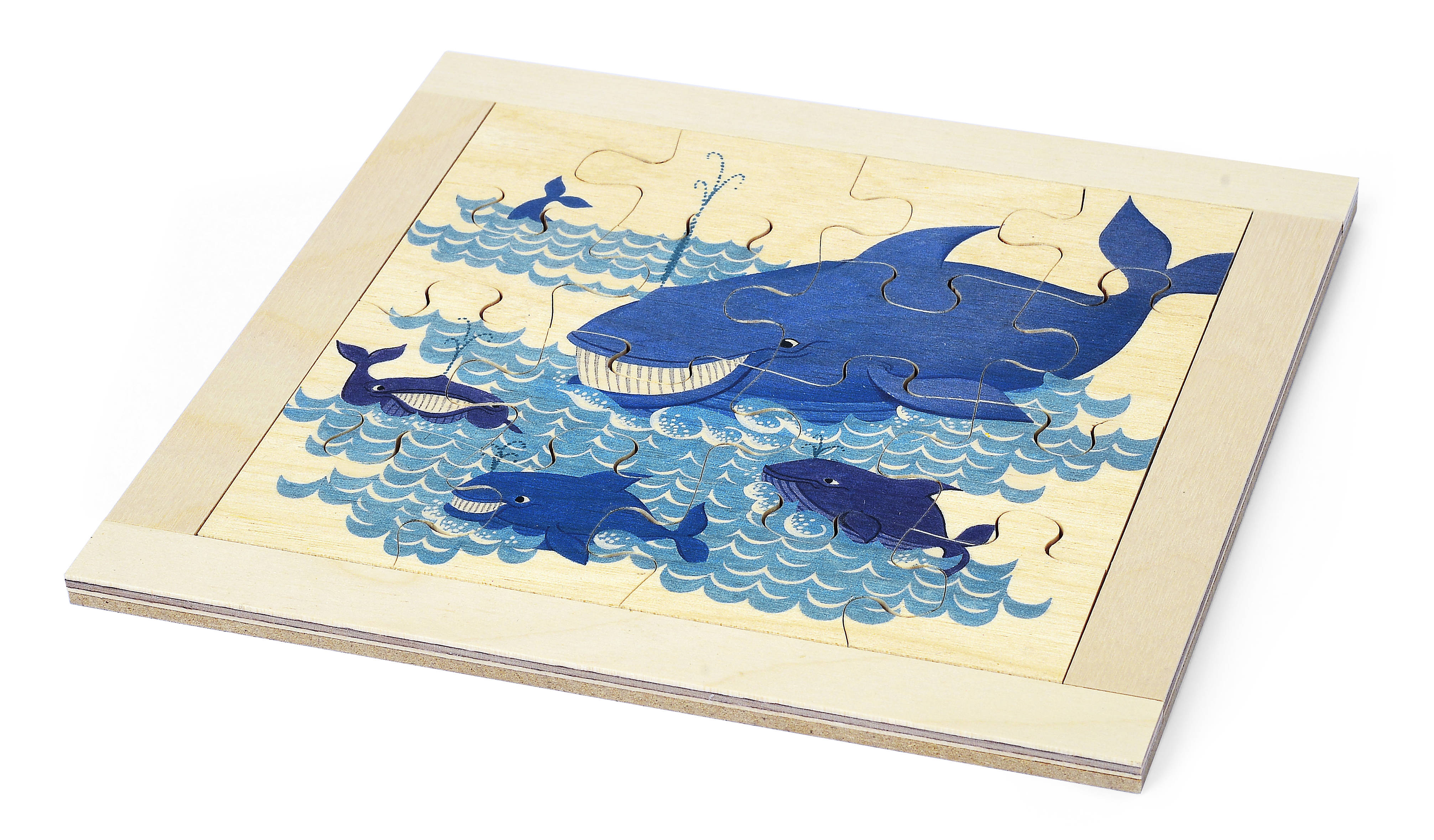 Dieses 16-teilige Sperrholzpuzzle zeigt eine sanfte Walfamilie in einer lebendigen Unterwasserszene. Ideal für Kinder ab 3 Jahren, fördert es spielerisch Feinmotorik, Konzentration und das Interesse an der faszinierenden Welt der Meerestiere.